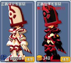 這是甚麼?很像速霸陸的戰衣?這是GC裏的正義保安官的衣服,白色的,為劍士愛利西思專用。黑色的是正義指揮官,不要看跟保安官相反顏色就以為一面是正義,一面是邪惡,其實兩個都代表正義。不過指揮要錢真錢買,這個正義有點…